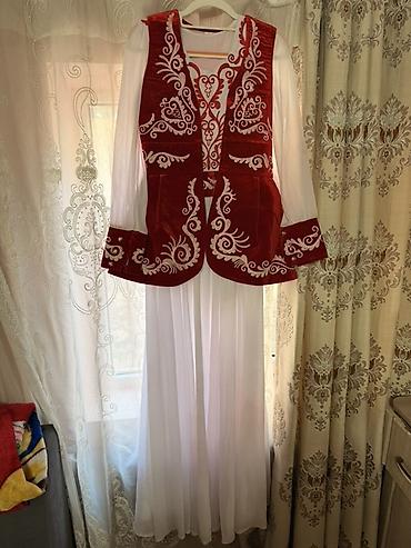 2) Традиционный бело-бордовый комплект: белое длинное платье из лёгкой ткани + бархатный бордовый жилет с контрастной белой вышивкой; манжеты с вышивкой в тон. Новая, цена 600с