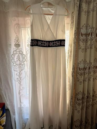 3) Белое вечернее платье-макси без рукавов с запахом на лифе и тёмным поясом, украшенным тонкой розово-белой вышивкой. Одевали пару раз, цена 200с