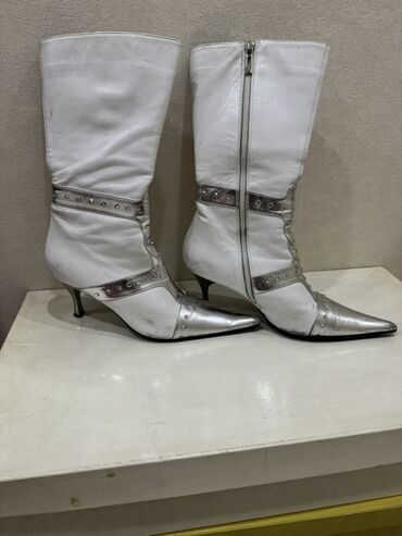2) Белые сапоги‑ботфорты по икру с острым мысом: