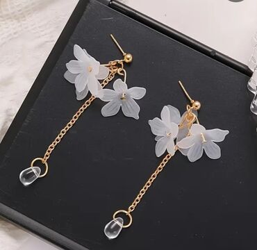 - Пара 2: асимметричные серьги-гвоздики с матовыми белыми цветами и золотистой цепочкой, на конце — прозрачная капля‑подвеска.