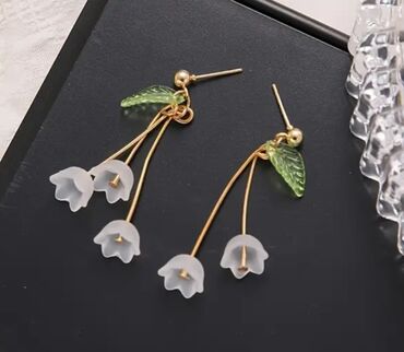 - Пара 1: длинные серьги-гвоздики с подвесками в виде колокольчиков из матового белого акрила и зелёных листочков. Тонкие изогнутые штифты под золото, по три цветка на каждую серьгу.