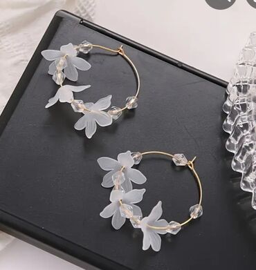 - Пара 3: кольца-хупы с матовыми белыми цветами и прозрачными гранёными бусинами по окружности, тонкая основа под золото.