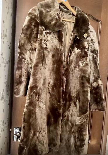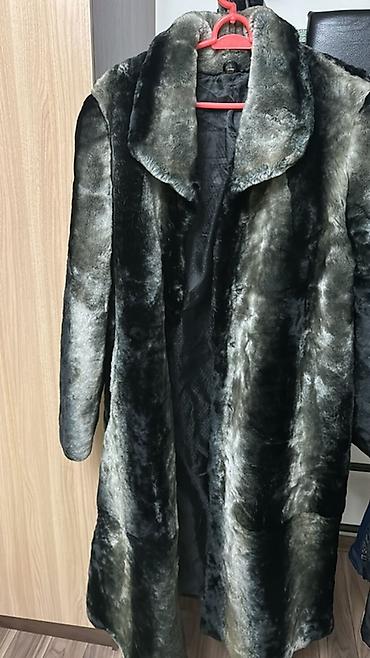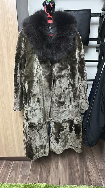2) Длинная шуба из мутона с объемным темным меховым воротником, скрытая застежка, боковые карманы, неоднородный серо-оливковый оттенок.