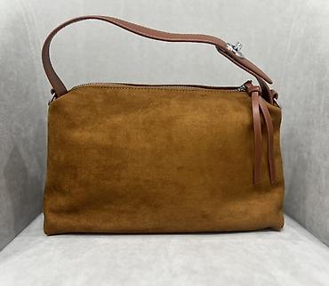 3) Компактная замшевая сумка на плечо, цвет коньячный