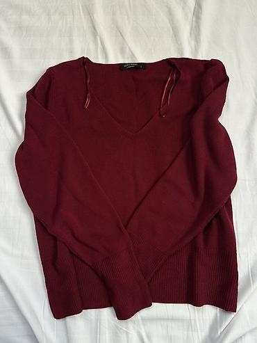 - Бордовый вязаный свитер с V-образным вырезом, длинными рукавами и широкими трикотажными манжетами и нижней планкой; мягкая фактура.