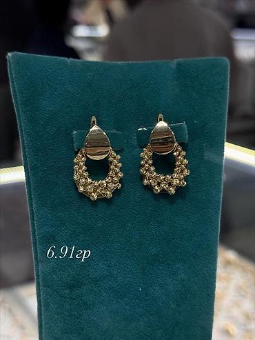 - Серьги – 6,91 г за пару. Дизайн: каплевидная гладкая верхняя часть и округлая нижняя часть из фактурных «зернышек», образующих объемное кольцо. Застежка-петля/английская (по фото – верхняя дужка).