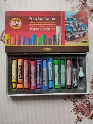 - Набор мягкой сухой пастели Koh‑i‑Noor Toison d’Or, 12 цветов (Extra Soft Pastels, диаметр стержня 12 мм). Яркие, хорошо растушёвываются, подходят для тонирования и смешивания.