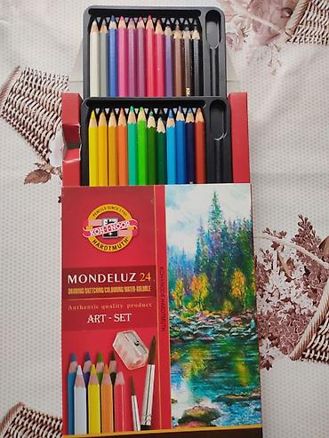 - Акварельные цветные карандаши Koh‑i‑Noor Mondeluz, 24 цвета (ART SET). Двухъярусный пенал, насыщенные пигменты, размываются водой для акварельных эффектов, подходят для рисования, скетчинга и раскрашивания.