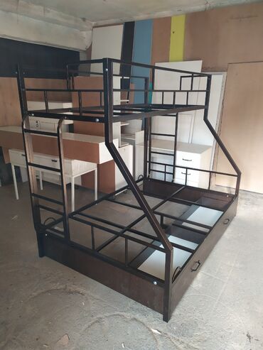 Просторное спальное место внизу (120х190 см) и стандартное (90х190 см) сверху. Доступны варианты с ящиками и навесной полкой. Подберем матрасы от 3500 сом При заказе кровати с матрасами доставка по Бишкек БЕСПЛАТНО! Звоните!
