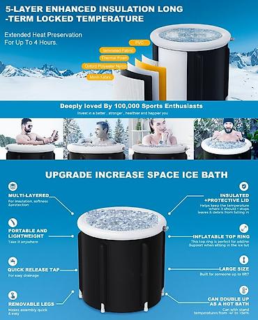 Дизайн подходит для большинства размеров - эта портативная ванна имеет легкий вес и является простым способом сделать холодную терапию частью ежедневного питания. Изготовлен из 3 слоев прочного, водонепроницаемого, прочного на разрыв материала, который поддерживает внутреннюю температуру.