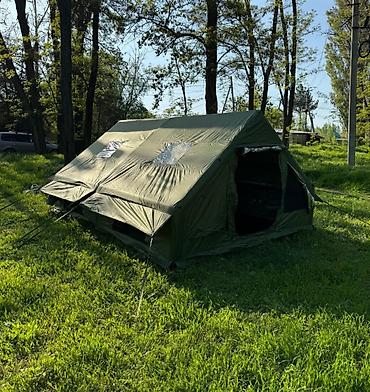 - Материал тента: плотная влагозащитная ткань камуфляжно-оливкового цвета. Усиленные швы, штормовые оттяжки по периметру.