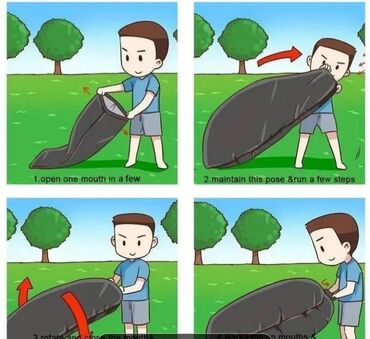 Легко надувается без использования насоса, достаточно наполнить его воздухом, двигаясь.
