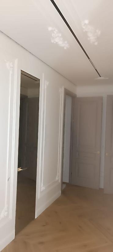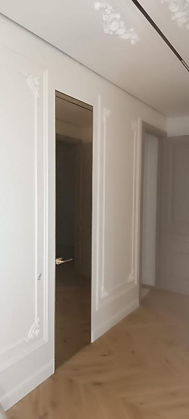 - Встроенные (скрытые) двери в стеновых панелях с классическими молдингами: полотно и наличники заподлицо, петли скрытые, золотистая фурнитура.