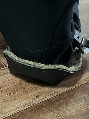- Материал: внешняя часть — толстая кожа, внутренняя — войлок для теплоизоляции и амортизации.