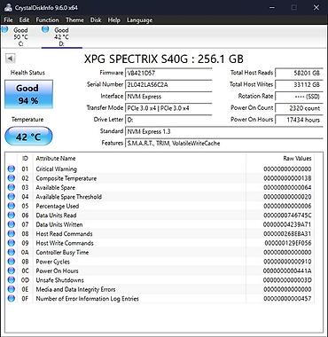 ADATA Spectrix S40G PCIE 3.0 SSD 256 GB