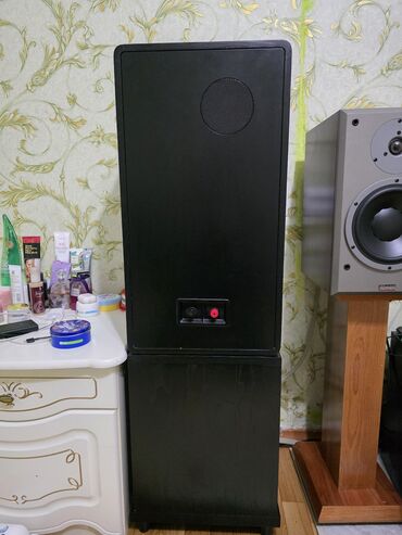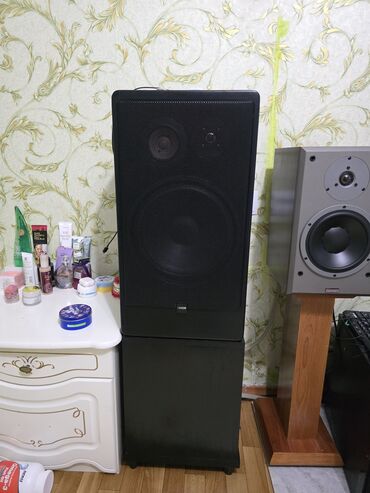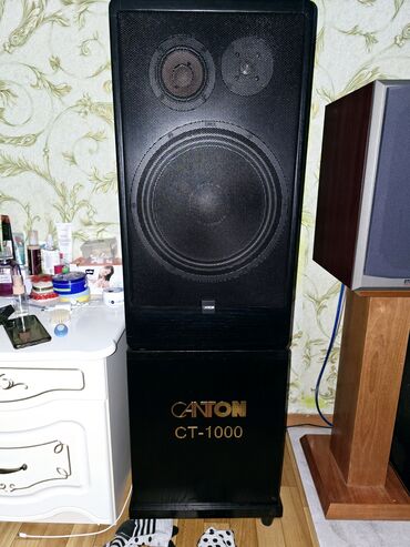 - Напольная акустика в двух секциях: верхний модуль с динамиками и нижний массивный оснований-кабинет с логотипом Canton CT-1000.