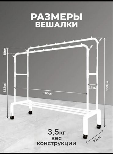 Универсальная напольная вешалка для одежды с двойной перекладиной и дополнительными полками. Изготовлена из усиленного металла, способна выдерживать нагрузку до 100 кг. Оснащена колесиками для удобного перемещения и боковыми крючками для аксессуаров. Компактный дизайн позволяет эффективно использовать пространство для хранения одежды, обуви и других предметов.