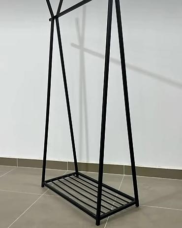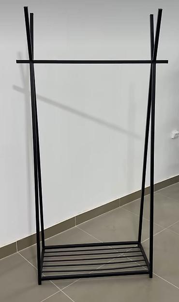- Конструкция: свободностоящий рейл с перекладиной для плечиков и нижней решетчатой полкой для обуви или коробок.