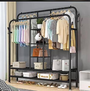 Многофункциональная напольная вешалка-стеллаж с двумя штангами для одежды. Она оснащена центральными полками для хранения сложенных вещей, коробок и обуви, а также боковыми крючками для сумок и аксессуаров. Прочная металлическая конструкция обеспечивает устойчивость и долговечность. Доступна в белом и черном цвете, эта вешалка идеально подходит для организации пространства в спальне, прихожей или гардеробной, позволяя удобно разместить большое количество предметов.