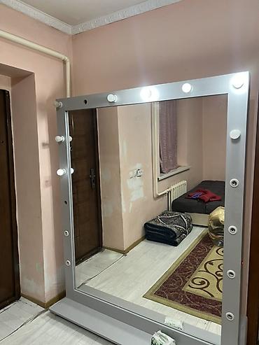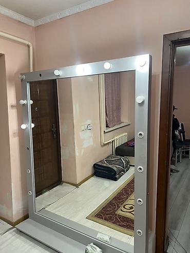 - Подсветка: по периметру предусмотрены патроны под лампы “голливудского” типа; часть ламп установлена и светит холодным белым светом. Кнопка/индикатор на боковой стойке.
