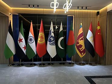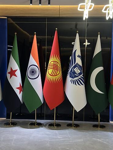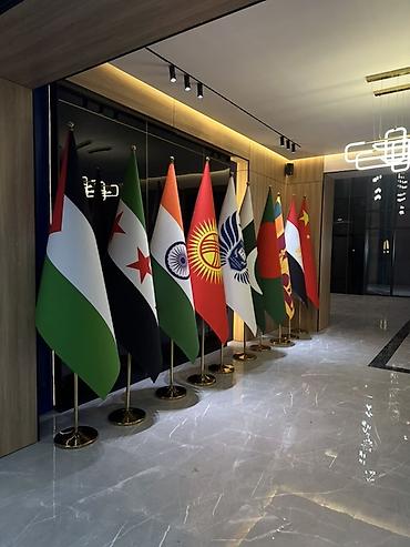 - Комплект напольных флагов с гербовыми и государственными полотнищами (пример на фото: Кыргызстан, Индия, Пакистан, Бангладеш, Египет, Китай и др., а также флаги ведомств/организаций).