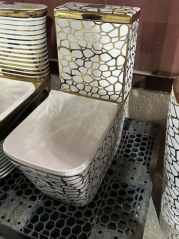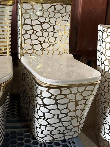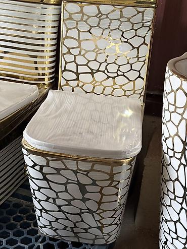 - Дизайнерская отделка: белая керамика с золотистым геометрическим узором по корпусу и бачку, декоративные золотые элементы