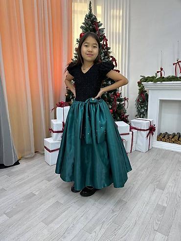 - Юбка: пышная макси из изумрудной тафты с мягким переливом, многоярусная, со съемным/накладным бантом спереди и мелкими декоративными стразами.