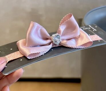 - Повязка на голову из эластичной ленты с атласным бантом и центральным украшением в форме сердечка.