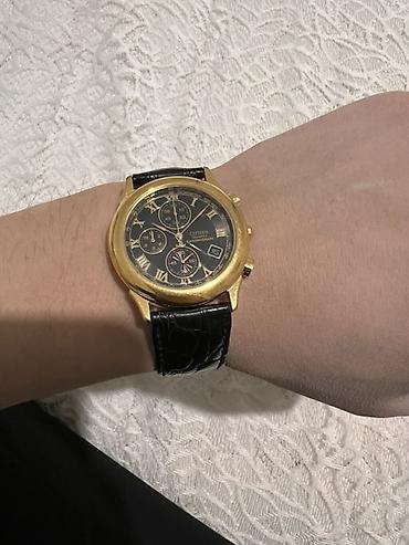 Стильные часы в строгом классическом исполнении: контрастный черный циферблат, золотистый корпус и функциональный хронограф — универсальный вариант под деловой и повседневный образ.