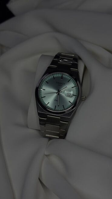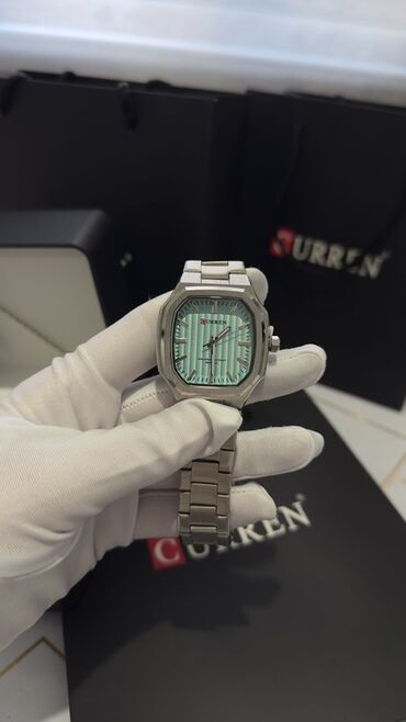 - Циферблат: бирюзовый с вертикальной текстурой, метки-индексы, три стрелки