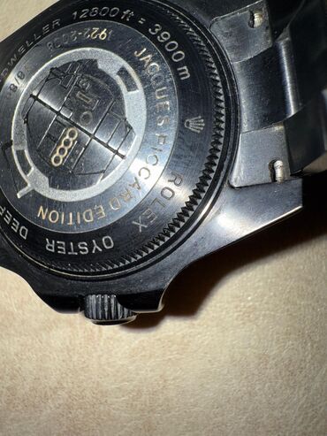 - Задняя крышка: гравировки с указанием глубины 12800 ft / 3900 m и надписей «Oyster», «Sea-Dweller», «Deepsea», «Jacques Piccard Edition» (см. фото).