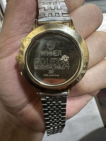 - Корпус: двухцветный, желтое и белое золото с бриллиантами 585 пробы; задняя крышка с гравировкой “WINNER ROLEX 24 AD DAYTONA 1992”, логотипом короны и отметкой “585 | N&L watches”.