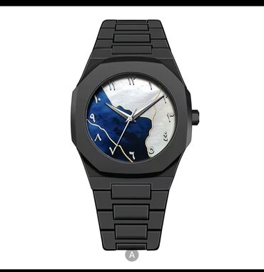 - Аналоговая модель с черным браслетом и циферблатом в стилистике карты/берега: перламутрово‑белые и синие сегменты, арабские цифры по кругу, три стрелки.