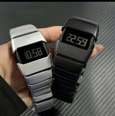 - Лаконичные цифровые часы с сегментным дисплеем: корпус и браслет в едином монолитном стиле, два цвета на выбор — матовый серебристый и графитово‑черный. Крупные цифры, 24‑часовой формат, прямоугольный экран, браслет с широкими звеньями.