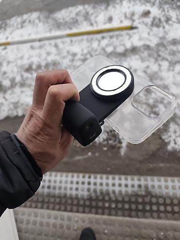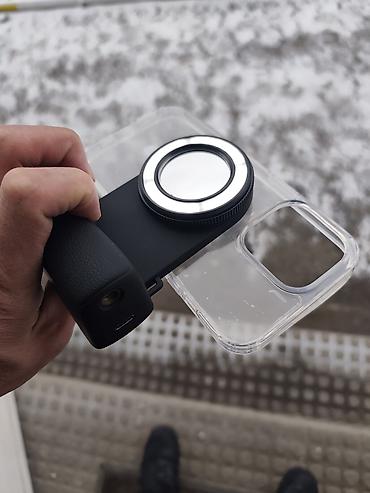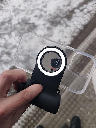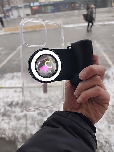 - Секционная конструкция: модуль с объективом/фильтром и светодиодным кольцом крепится к прозрачному чехлу смартфона (на фото показано совмещение).