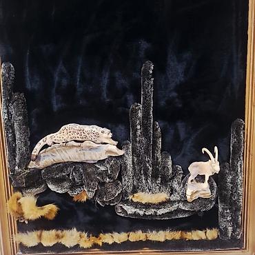 - Техника: смешанная, объёмные элементы, имитация скал и меховых кочек; пластичные резные фигурки животных.