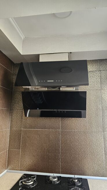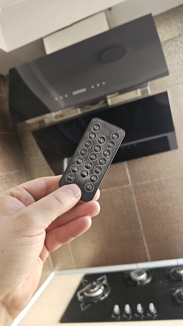 Современный дизайн с гладкой черной панелью, подходит для установки над газовой или электрической варочной поверхностью. Пульт позволяет включать/выключать вытяжку, регулировать скорость, включать подсветку и таймер, а также активировать дополнительные режимы.