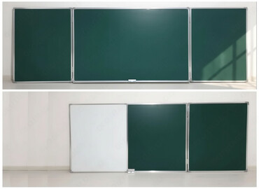 Многосекционная настенная доска, идеально подходящая для использования в учебных заведениях, офисах или конференц-залах. Доска имеет три основные секции: центральную, которая может использоваться как зеленая доска для письма мелом, и две боковые секции, которые могут быть как зелеными, так и белыми. Белая секция подходит для письма маркерами. Прочная конструкция с рамой из алюминиевого сплава обеспечивает долговечность и устойчивость. Доска снабжена лотком для мела или маркеров, что добавляет удобства в использовании. Легко монтируется на стену, предлагая гибкие варианты для презентаций и обучения.