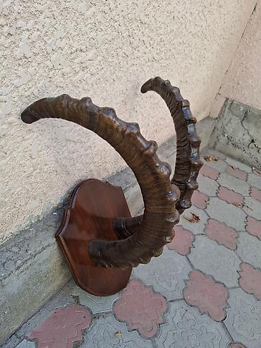 - Эффектный трофейный декор: пара массивных скрученных рогов с выраженными ребрами, натуральный коричневый оттенок с полировкой и глянцевым блеском.