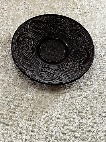 - Декоративная тарелка настенная, темная (почти черная) глазурь, рельефный орнамент по полю и борту. Можно использовать как одиночный акцент или в композиции.