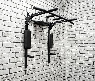 Настенный турник с брусьями и упорами для пресса. Конструкция позволяет выполнять различные упражнения для развития мышц верхней части тела и пресса. Оборудован мягкими подлокотниками и спинкой для комфорта во время тренировок. Крепится к стене, что позволяет экономить место в помещении. Подходит для использования в домашних условиях.