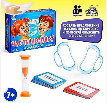 - В комплекте на изображении: коробка игры, песочные часы, набор карточек с заданиями разного типа, пластиковые держатели для рта.
