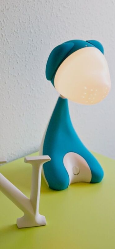 Необычный настольный светильник в форме забавной собачки. Выполнен в бело-голубой цветовой гамме. Светильник компактный и может использоваться как ночник или декоративный элемент в детской комнате. Устойчивая конструкция и мягкий свет создают уютную атмосферу.