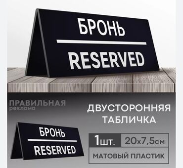 - Размер из изображения: 1 шт., 5 см (матовый пластик, двусторонняя табличка “БРОНЬ/RESERVED”).