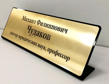 - На подставке — сменные полосы с именами/должностями.