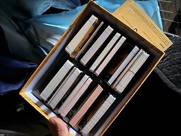 - В коробке множество колод с ролями/характеристиками/событиями (видны отсортированные стопки карт)