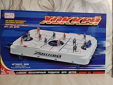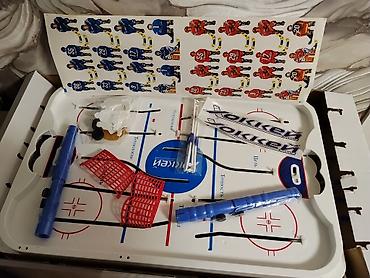 - В комплекте: игровое поле с направляющими, 2 ворота, рычаги/ручки управления, шайбы, фигурки игроков (наклейки для двух команд — красная и синяя), декоративные наклейки
