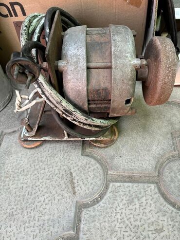 Точильно-шлифовальный станок на металлической стойке. Описание: - Крупный абразивный круг (ориентировочно 350–400 мм в диаметре) для заточки и грубой обработки металла. - Привод от электродвигател...