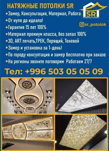 Натяжной потолок материалы и услугасы биригип 370 сомдон. работасын пагоно метр менен эсептейбиз. Натяжной потолоктун бардык турун жазайбыз... Бекер замер кылабыз. Бекер маалымат беребиз. Жыты жок ...
