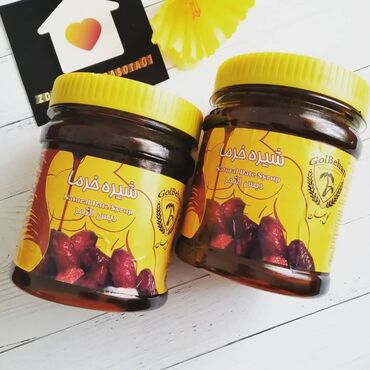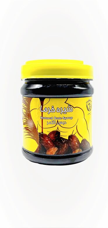 Натуральный финиковый сироп представлен в стеклянной банке с желтой крышкой. Этикетка на банке выполнена в желтом цвете с изображением фиников и пальмы, а также содержит надпись "Natural Date Syrup". Продукт может использоваться в качестве полезного подсластителя для напитков, десертов и выпечки. Сироп имеет густую консистенцию и насыщенный темно-коричневый цвет.